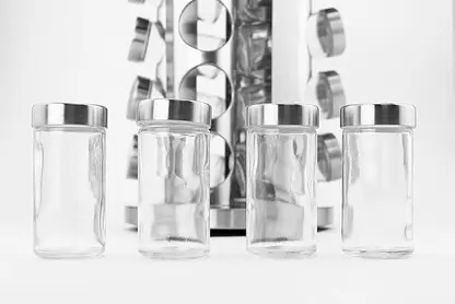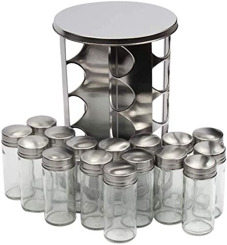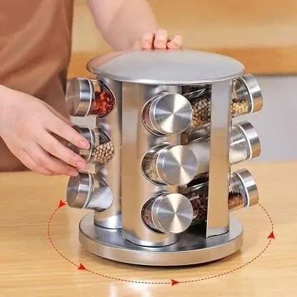 Maximize your storage space and minimize clutter. This revolving spice rack comes with matching glass jars that fit perfectly on the stand, keeping your favorite spices organized and within easy reach—without taking up unnecessary room.