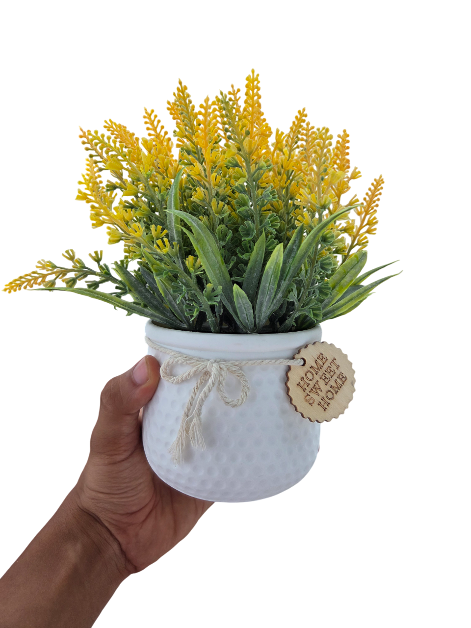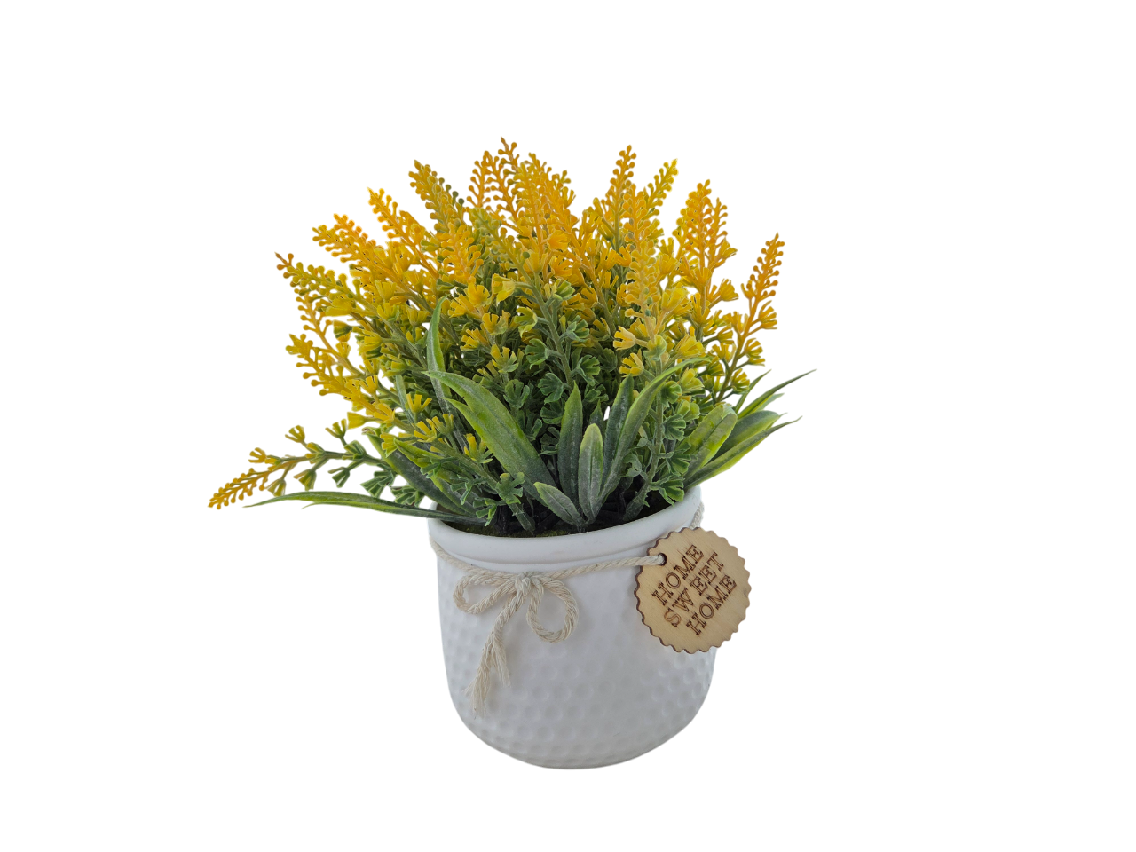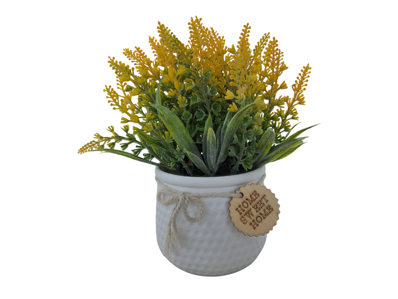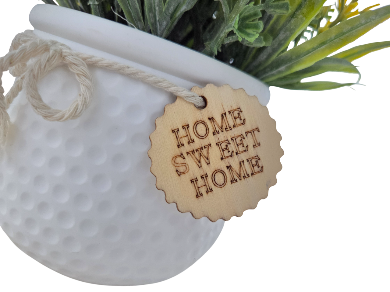 • Decorative Pot: White textured pot with rope bow and wooden “Home Sweet Home” tag for rustic charm.